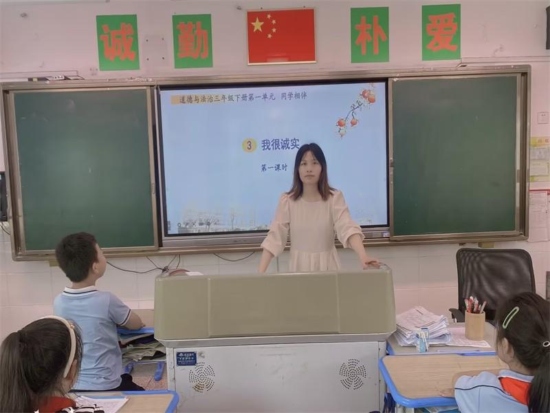 曹传慧老师执教部编版三下《我很诚实》。曹老师首先,通过“亲吻小猪”故事的导入,让学生明白诚实守信的重要性。其次,在交流“我心中的诚实行为”环节,学生们积极发言,分享了自己对诚实的理解和实践经历展现了学生们对于诚实品质的认同和追求。在课堂上,曹老师带领大家分析了说谎的原因和危害,引导学生们认识到说谎可能带来的负面后果,让学生们深刻体会到了说谎给自己和他人带来的伤害,从而更加坚定了诚实的信念。