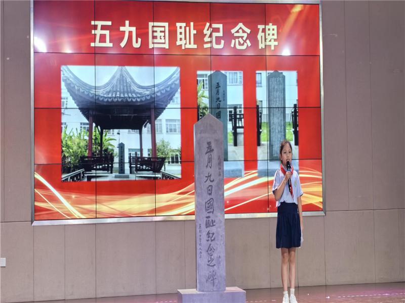 四(6)班方潇可同学上台,缓缓道来“五九国耻纪念碑”的故事。她讲到,这块碑是历史的见证,静静矗立着,时刻提醒大家:“要铭记过去、居安思危,落后就要挨打,唯有自强才能复兴!”平实的话语,让同学们读懂了纪念碑背后的重量,更坚定了“为中华之崛起而读书”的信念。