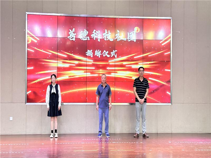 樊春琦主任、周丹副校长与科技教练吕国荣为 “善德科技社团” 揭牌,点燃同学们探索创新、勇攀科技高峰的热情。