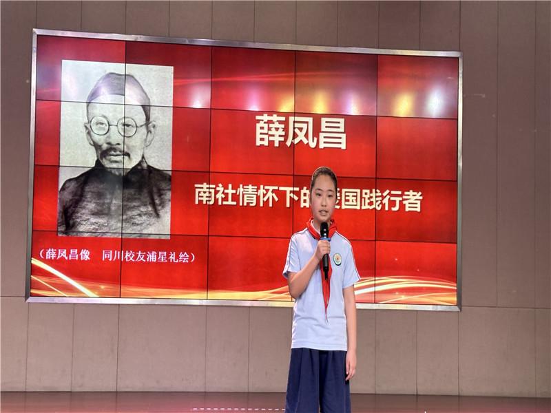 六(6)班刘俏楠同学上台,声情并茂地讲述了薛凤昌先生的爱国故事。当讲到薛先生“我以我血荐辕轩”的坚定时,台下师生无不动容——这是中国版“最后一课”的坚守,更是红色基因最生动的诠释。薛凤昌先生用自己的生命抵抗了日寇的文化侵略,护卫了中国人自己的文化家园,他的精神将永远激励着我们奋勇向前。