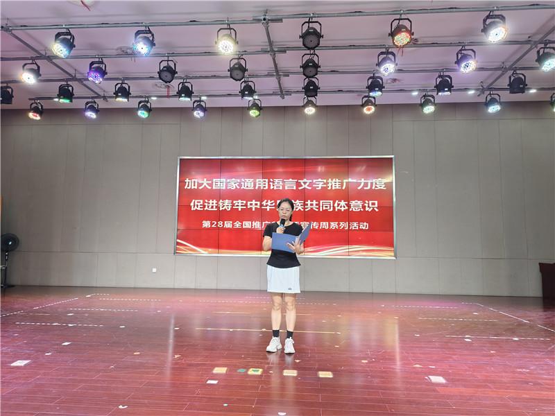教导处孙惠芬主任登台分享,以《加大国家通用语言文字推广力度 促进铸牢中华民族共同体意识》为题,生动阐释普通话作为“交流密码”“文化纽带”的意义——标准的普通话能打破地域隔阂,规范的汉字可传承民族文化,更能助力铸牢中华民族共同体意识。她呼吁同学们从课堂发言的清晰表达、课间交流的文明用语开始,让普通话成为校园里传递温暖与团结的“最美声音”。