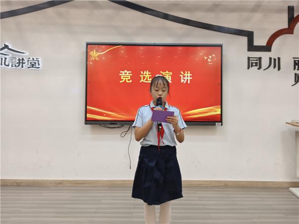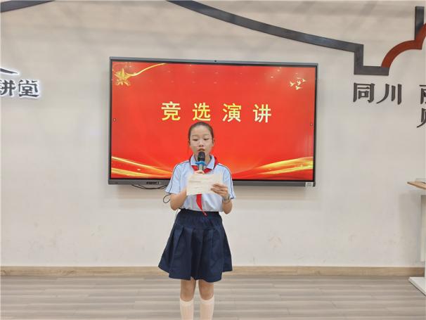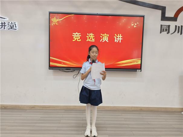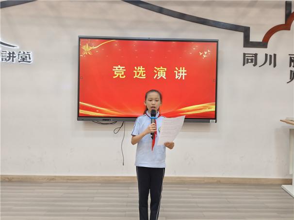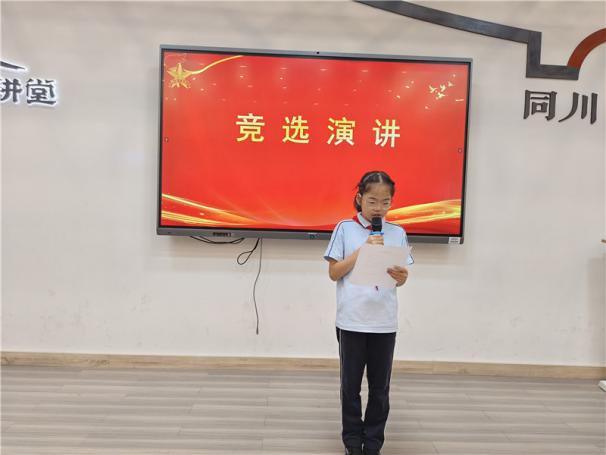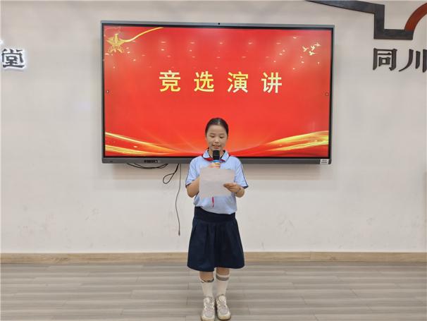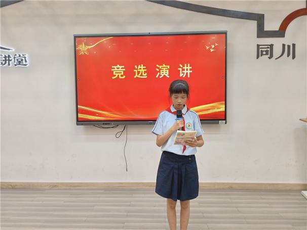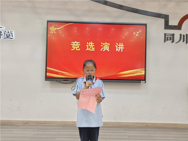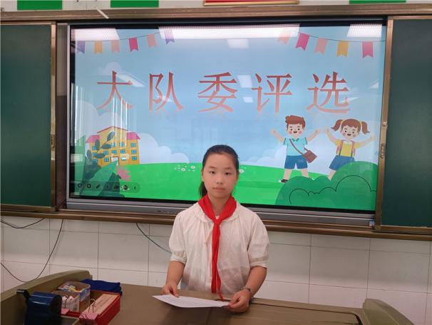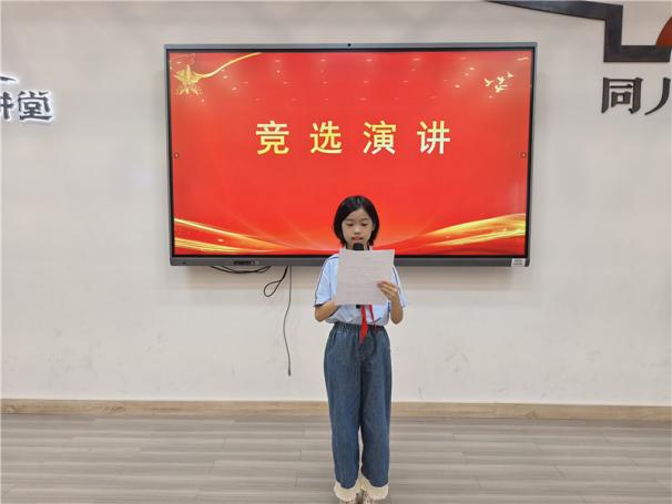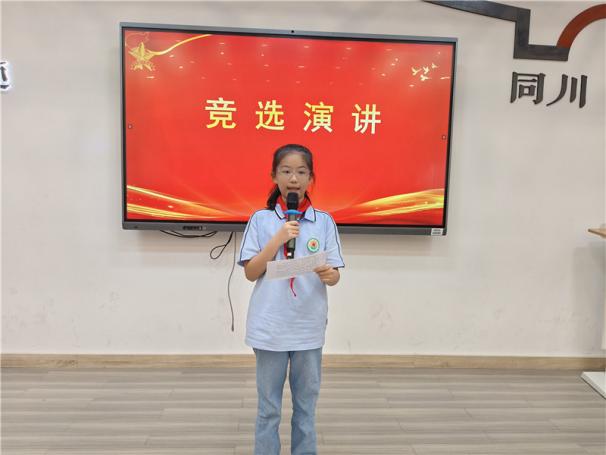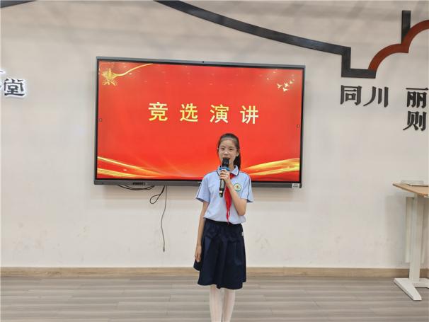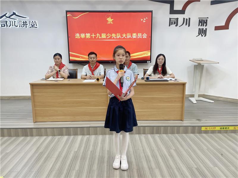 新任大队长陈睿熙作为代表发言,她面向全体队员发出倡议:“我们会牢记习总书记的教导,高举队旗跟党走,立志向、修品行、练本领,争做新时代好队员;积极参与社会实践活动,用实际行动为实现中华民族伟大复兴的中国梦贡献力量!”她的发言铿锵有力,道出了全体大队委员的心声,也感染着现场每一位队员。