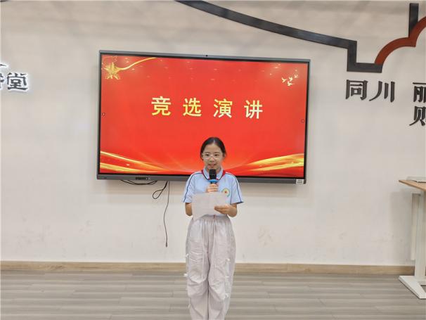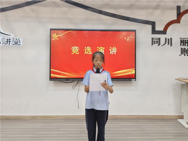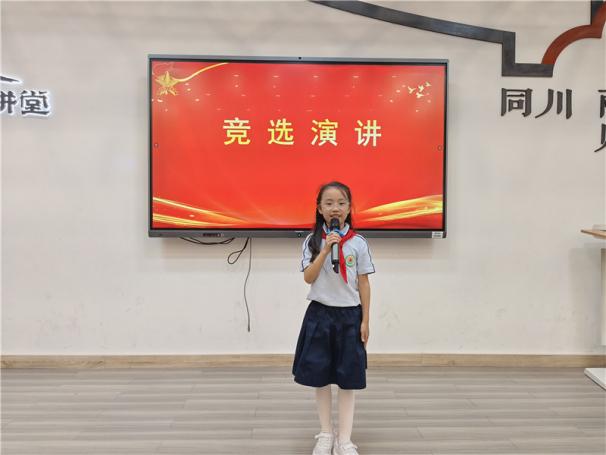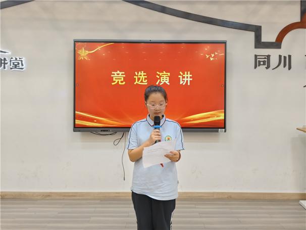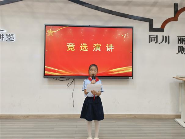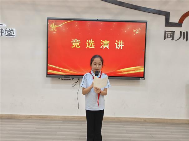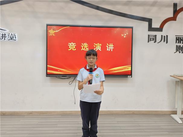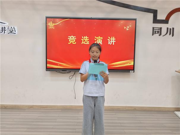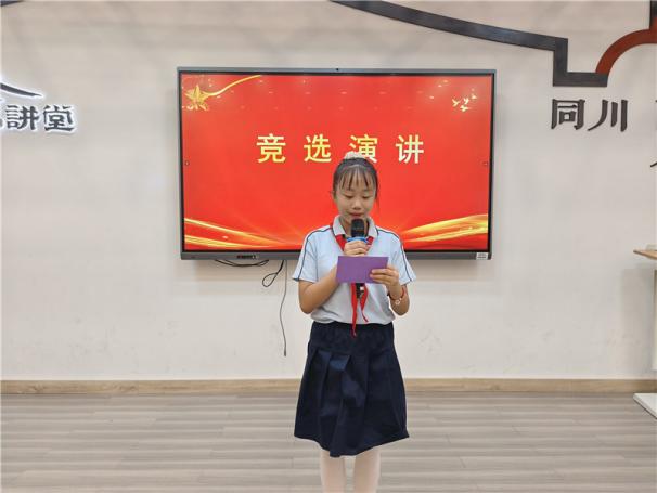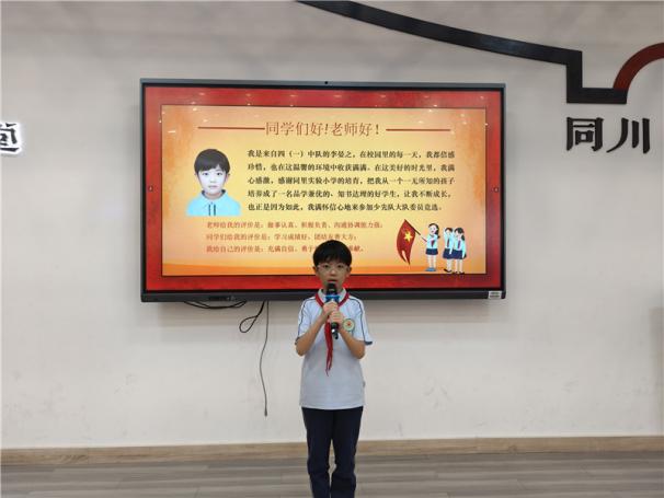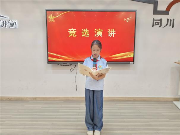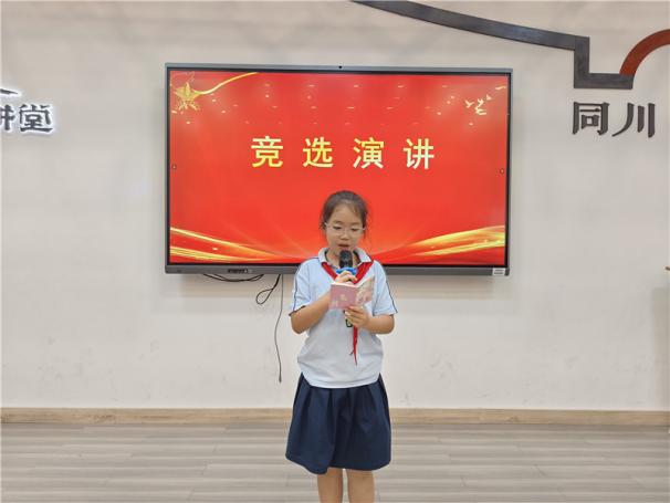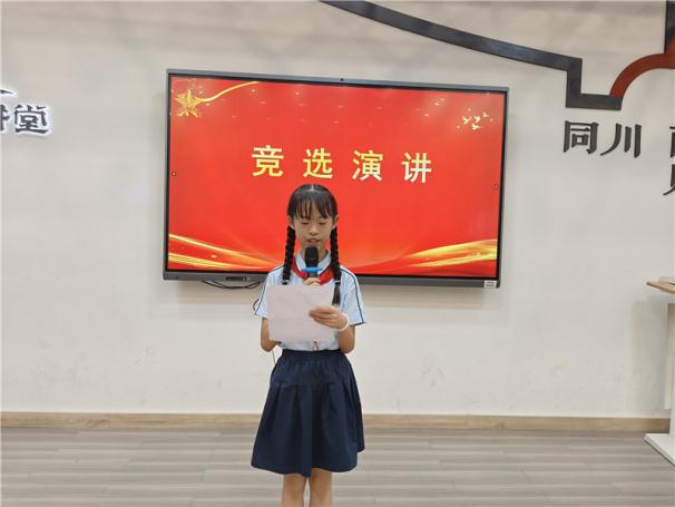 新任大队长陈睿熙作为代表发言,她面向全体队员发出倡议:“我们会牢记习总书记的教导,高举队旗跟党走,立志向、修品行、练本领,争做新时代好队员;积极参与社会实践活动,用实际行动为实现中华民族伟大复兴的中国梦贡献力量!”她的发言铿锵有力,道出了全体大队委员的心声,也感染着现场每一位队员。