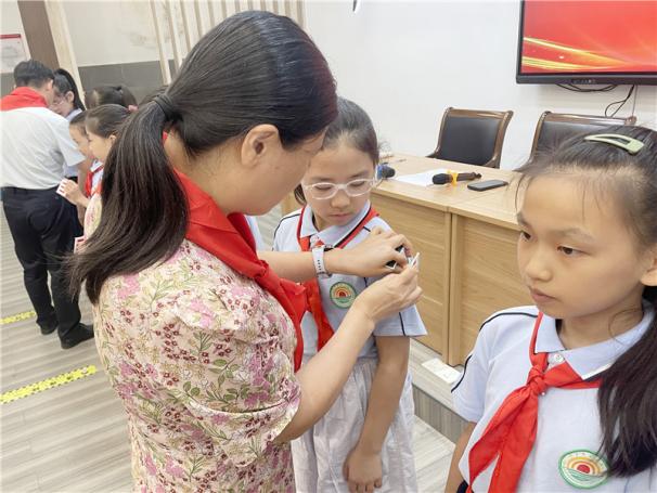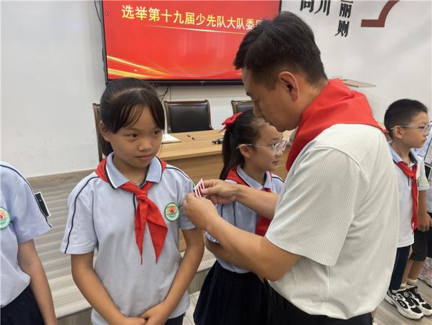 吴方明校长、闵荣生副校长、陈红芬主任为新一届大队委员佩戴大队委标志。当象征荣誉与责任的标志别在胸前时,每位委员的脸上都洋溢着自豪的笑容——这不仅是对他们过去努力的认可,更是对未来服务队员、建设校园的激励。