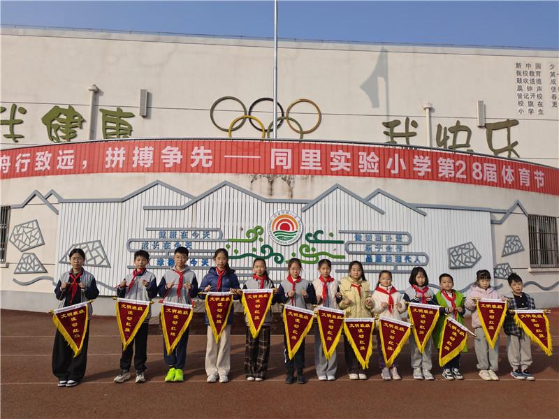 德育处陈红芬主任为各年级表现优秀的班级授流动红旗,鲜红的旗帜在阳光下熠熠生辉,不仅是对获奖班级的肯定,更激发了全体同学争先创优的热情。